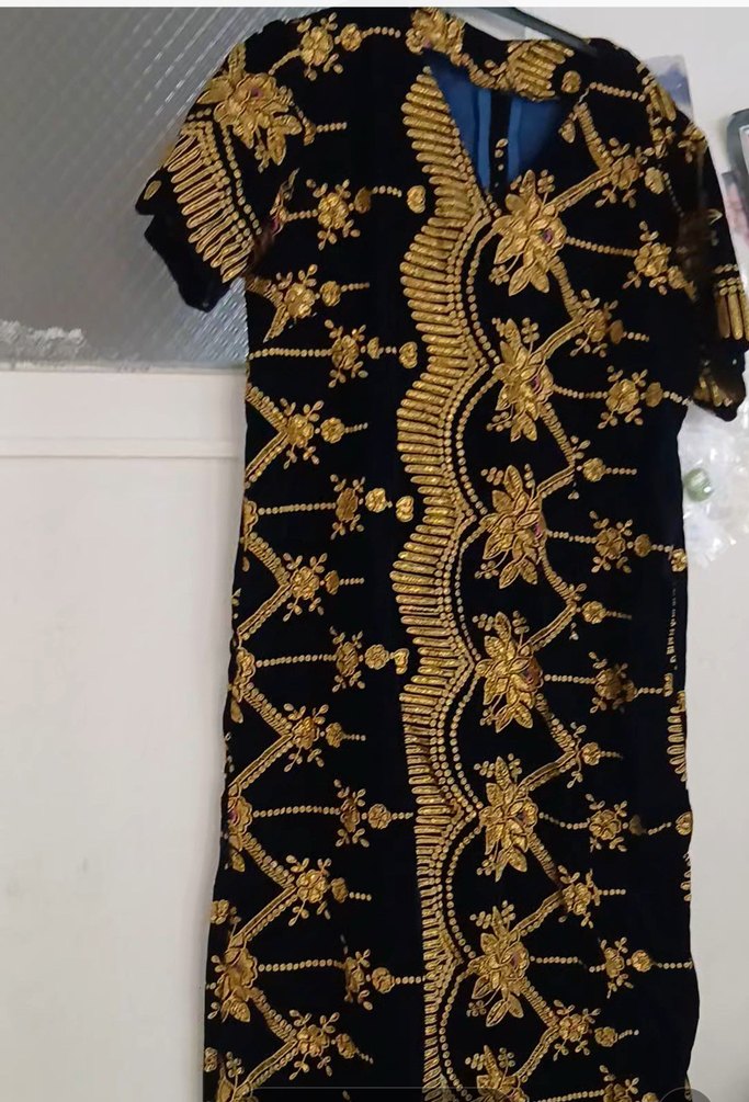 Koyu renkli kumaş üzerine altın renkli işlemeler ve boncuk detaylarıyla süslenmiş, kısa kollu, V yakalı, bohem tarzda, vücuda oturan uzun elbise.
