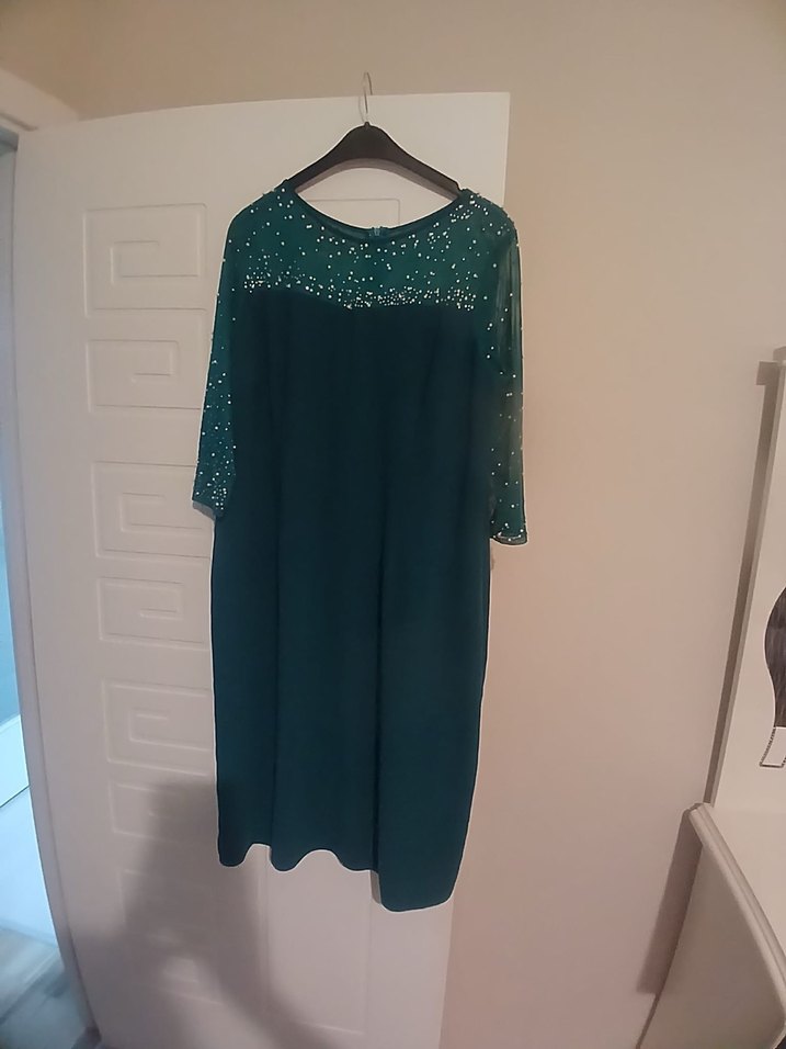 Boncuk işlemeli, uzun kollu ve yuvarlak yakalı uzun yeşil abiye elbise, bol kesimiyle klasik ve şık bir görünüm sunar. Düğünler için uygundur.