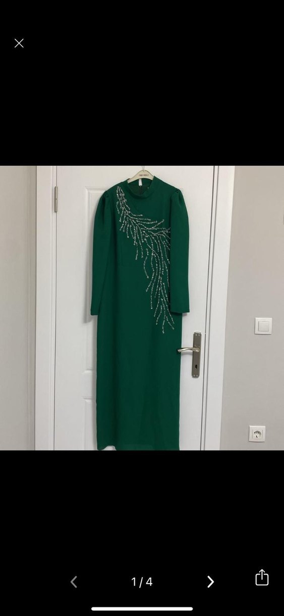 Boncuk işlemeli, uzun kollu, yuvarlak yaka yeşil elbise. Regular kesim ve sentetik kumaştan, günlük kullanıma uygun, sade ve mütevazı tarzda. ✨