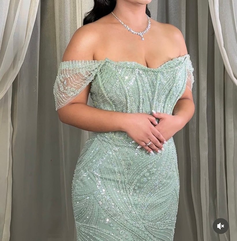 Işıltılı boncuk işlemeleriyle süslenmiş, straplez ve uzun yeşil abiye elbise. Omuzları açık, vücuda oturan kesimiyle düğünlere uygundur.