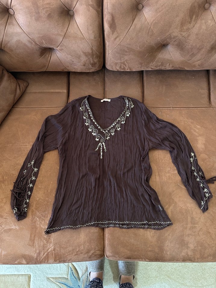 Koyu kahverengi, tül kumaştan, boncuklu ve işlemeli V yaka uzun kollu bol kesim bluz. Bohem tarzı yansıtır, günlük kullanıma uygundur.