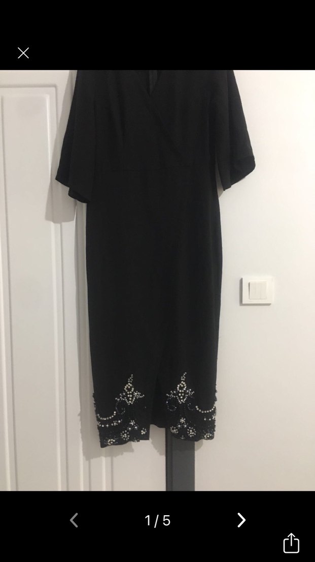 Dar kesim siyah uzun elbise, kısa kollu ve V yakalıdır. Etek kısmında boncuk işlemeleri bulunmaktadır. Hiç giyilmemiştir