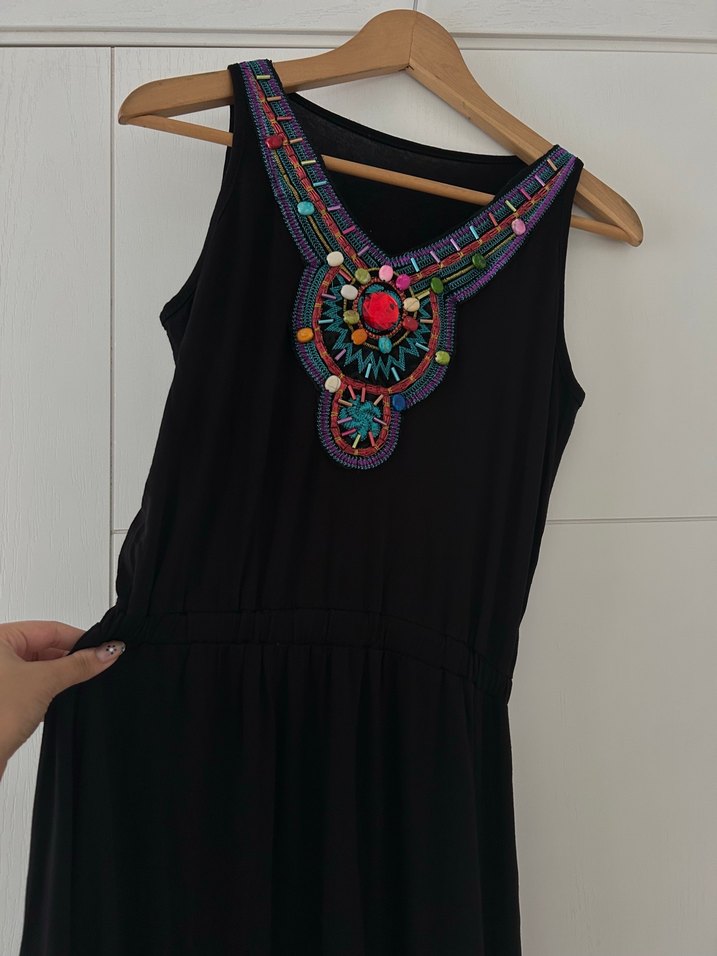 Boncuk işlemeli renkli V yaka, uzun ve kolsuz bohem elbisedir. Yumuşak tekstil kumaş ve bol kesimlidir, günlük kullanıma uygundur.