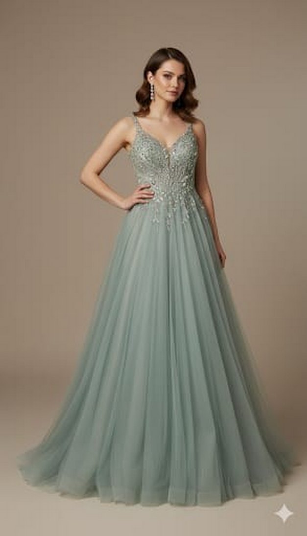 Boncuk İşlemeli V Yaka Uzun Gri Abiye Elbise