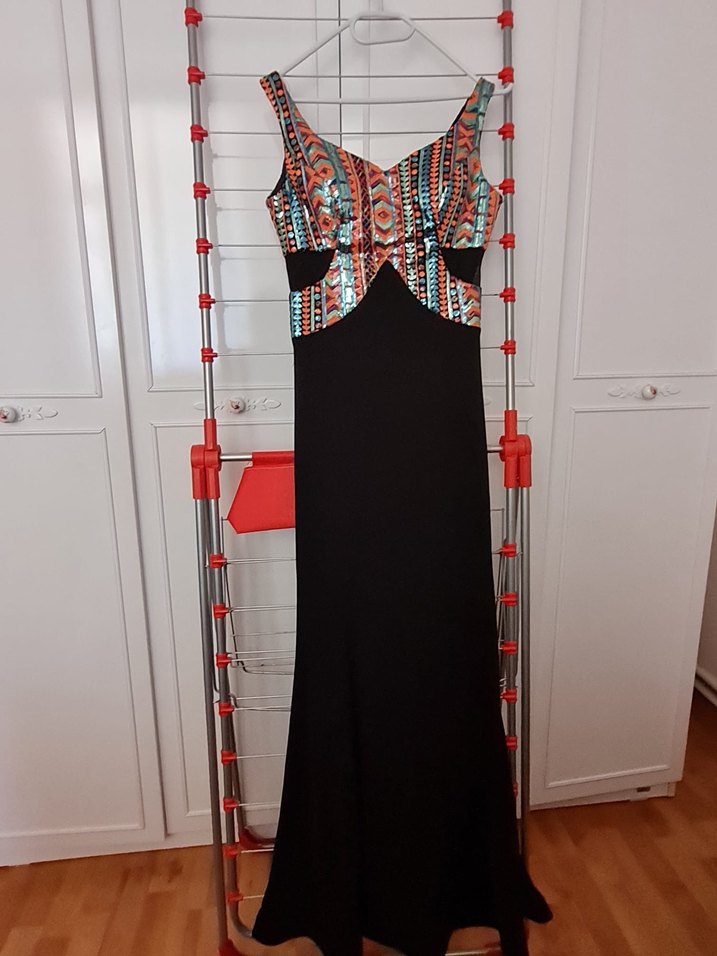 Pul işlemeli, baskılı üst kısmı ve koyu renk uzun etekli, kolsuz, V yakalı uzun bohem elbise, romantik akşamlar için uygun.