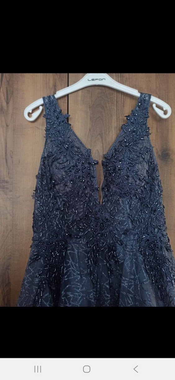 Lacivert, V yakalı ve kolsuz bu uzun elbise, boncuk işlemeleri ve nakış detaylarıyla parti için goth tarzını yansıtıyor.