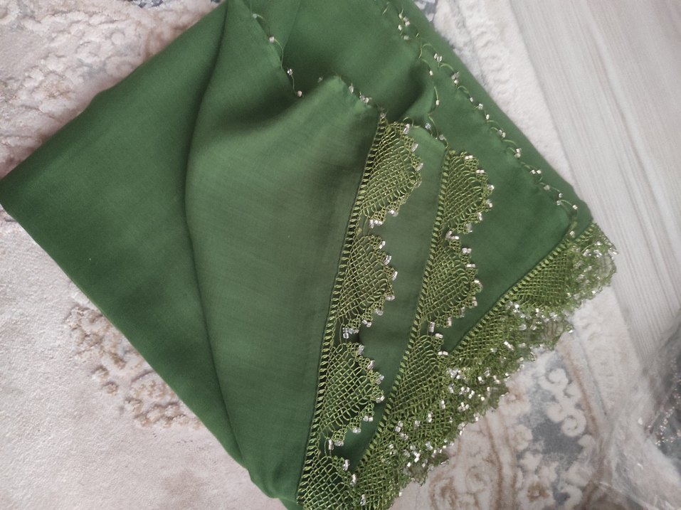 Yeşil renkte, boncuk işlemeli kenar detaylarıyla bohem tarzda kadın tülbent iğne oyası