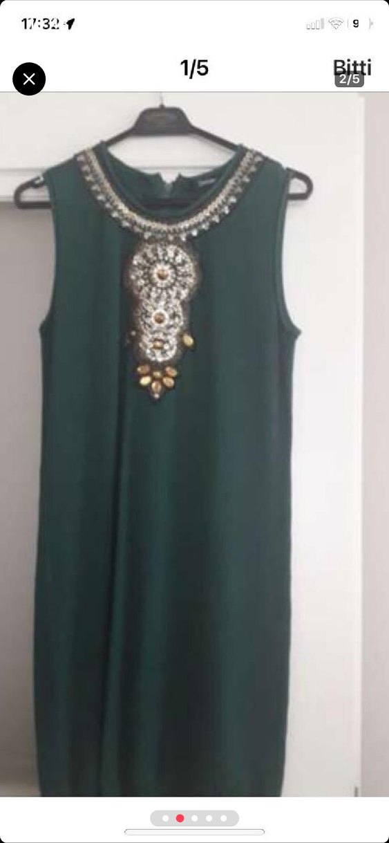 Yuvarlak yaka, boncuk işlemeli ve nakış detaylı, kolsuz yeşil uzun elbise. Bohem tarzda, bol kesim, düğünler için uygun.