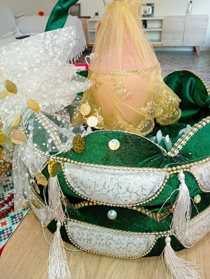 Boncuk işlemeli, açık yeşil tonlarında, püsküllü avant-garde kına sepeti geleneksel ve modern içinde mum , mendil, testi de mevcuttur
