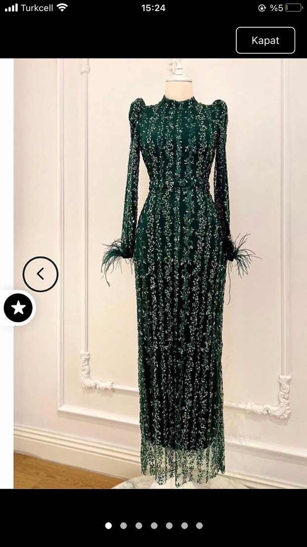 Boncuk işlemeli ve nakış detaylı koyu yeşil uzun abiye elbise. Uzun kollu, tüy detaylı manşetler ve yüksek yakaya sahiptir. Düzenli kesimle parti için ideal. ✨