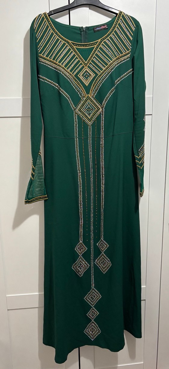 Boncuk işlemeli ve nakışlı detaylara sahip, V yaka ve uzun kollu yeşil uzun elbise. Bilek kısmı dantellidir. Regular fit ve mütevazı bohem tarzda, yumuşak sentetik kumaştan yapılmıştır. Düğün için uygundur.