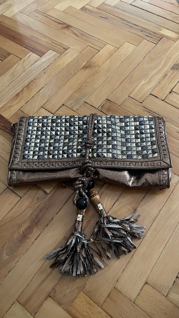 Koyu kahverengi deri clutch çanta, boncuk işlemeli ve yılan desenli, püskül detaylarıyla bohem tarzda.