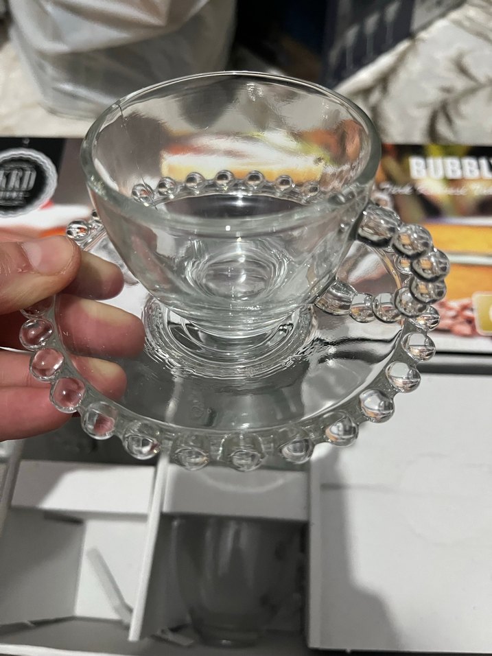 6 lı hiç kullanılmadı Boncuk kulplu cam kahve fincanları ve uyumlu tabaklardan oluşan set, espresso veya Türk kahvesi için uygundur. ☕