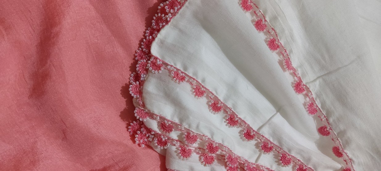 Yumuşak tekstil kumaştan, dantel ve incili işlemelerle süslenmiş açık pembe kadın fuları, vintage bohem tarzında.