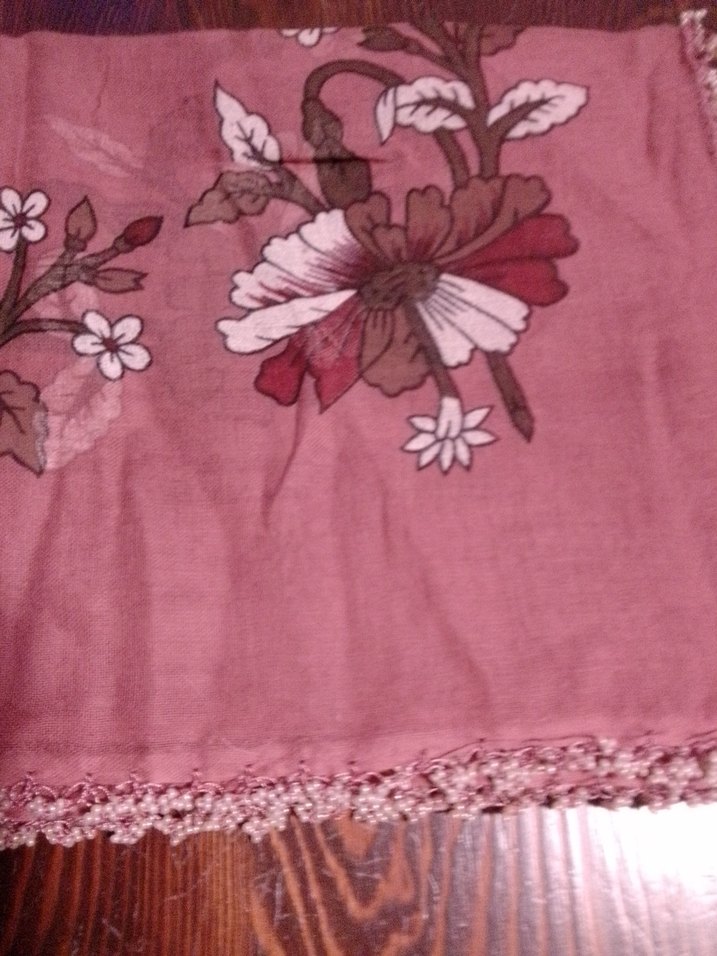 Pembe renkte, dantel detaylı ve çiçek desenli tekstil kumaştan yapılmış bohem tarzda kadın fular. boncuk oyası oyası tülbent, yemeni , fular ,mevlid örtüsü, dört tarafı çevrilidir 80x80 ebatlarındadır. Sıfır üründür. Telefon eski olduğu için renkleri tam çıkmıyor daha canlı renklerdir. #aksesuar #şal #atkı #tasarım #çeyiz #bohça #düğün #günlük #koton #örgü #bershka #zara #bolero #pareo #fular #bandana #yazma #yemeni #oya #boncuk #elişi #örtü #eşarp #mevlidörtüsü #tülbent #firkete #iğneoyası #mekikoyası #boncukoyası #kumboncuk