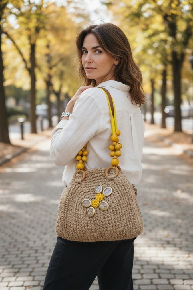 Sarı renkli, boncuk saplı ve nakış işlemeli hasır örgü bohem tarzda kadın çantası, günlük kullanım için uygundur.