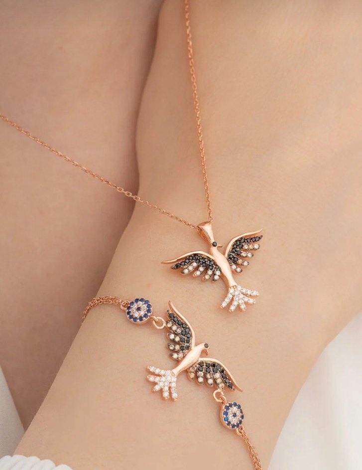 Boncuklu 925 ayar gümüş Altın kaplama Kuş Figürlü Kadın Kolye