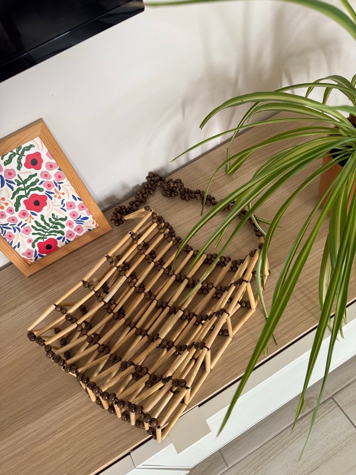 Bohem tarzda, koyu bej renkte ahşap boncuklardan oluşan, günlük kullanıma uygun kadın çantası.
