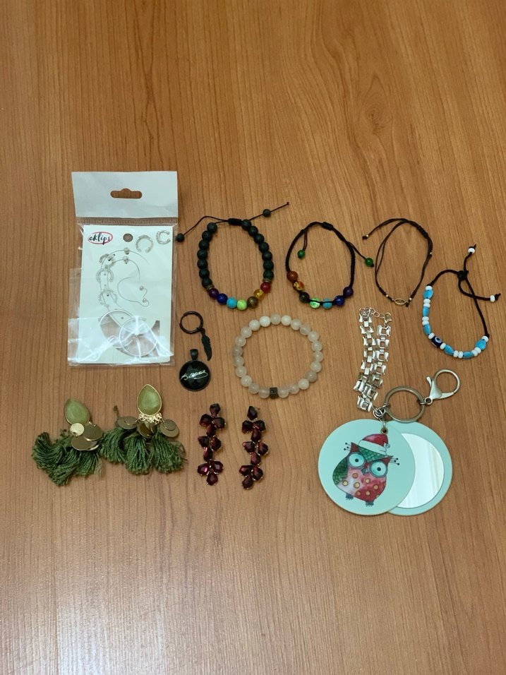 Çok renkli boncuklu bileklikler, dekoratif küpeler ve baykuş desenli anahtarlık 10 parça ürün
