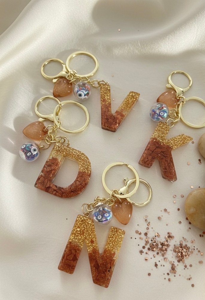 Parlak altın renkli, boncuklu ve bohem tarzda harfli anahtarlıklar, göz alıcı bir retro görünüm sunar. ✨