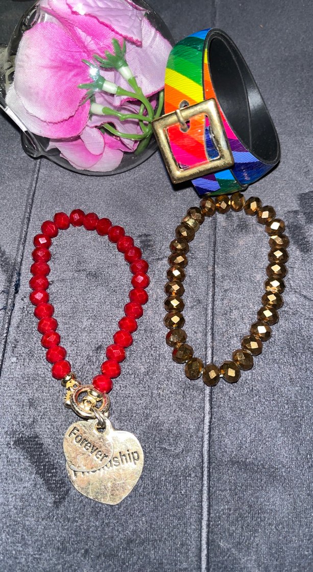 Altın ve kırmızı tonlarda boncuklu çocuk bileklikleri, 'Forever Friendship' yazılı desenli kalp charm ile bohem ve retro tarzı yansıtıyor. 3 lü ürün fıyatıdır