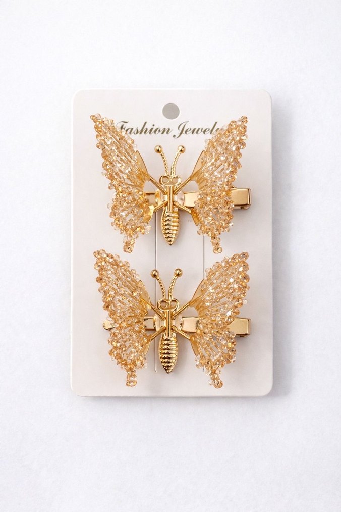 Boncuk detaylı, altın renk kelebek şeklinde saç tokaları.