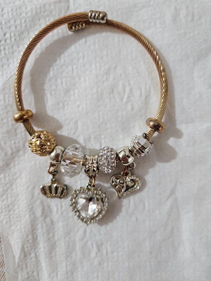 Boncuklu detaylara ve nakışlı desenlere sahip altın renkli bohem tarzı bileklik, kalp ve taç figürlü charmlarla süslenmiştir. ✨