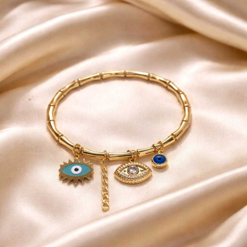 Altın renginde, üç göz figürlü boncuklu bohem tarzda, günlük kullanıma uygun bileklik.