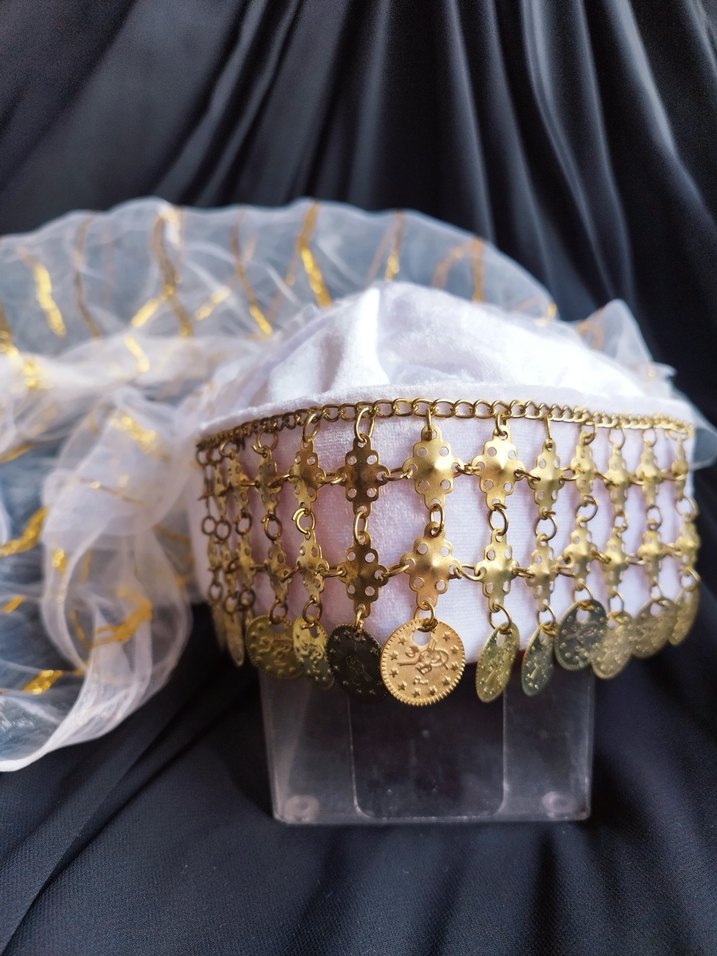 Sıfır Ürün - Gold Para Detaylı krem Kadife Fes ve Şifon tülü Özel günlerinizde şıklığınıza şıklık katacak, tamamen sıfır ve hiç kullanılmamış Gold krem renkli fes! Renk: Canlı ve göz alıcı Detaylar: Alın kısmında altın renkli, sallantılı otantik paralar ve zincir işlemeleri mevcuttur. Hareket ettikçe zarif bir ses çıkarır. Aksesuar: Üzerinde gold çizgili, tiril tiril şifon eşarbı ile birlikte gönderilecektir. Kullanım Alanları: Kına geceleri, folklor gösterileri, temalı partiler veya özel fotoğraf çekimleri için mükemmel bir seçimdir. Kaliteli işçiliğiyle fotoğraflarda çok canlı durmaktadır. Alıcısına hayırlı olsun! Kına Gecesi İçin Gold İşlemeli Fes (Sıfır) Hiç kullanılmamış, etiketi üzerinde sayılacak kadar temiz gold fes. Gold para süslemeleri eksiksiz ve parlamaktadır. Yanında görseldeki simli örtüsü de dahildir. Kına gecesi veya geleneksel etkinlikler için uygundur. Hızlı kargo yapılır. sallanan altın renkli paralara sahip kumaştan yapılmış bohem tarzda parlak saç aksesuarı.