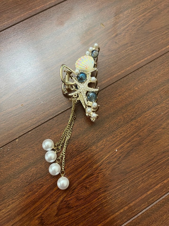 Boncuk, inci ve deniz kabuğu detaylı, altın renkli, zincirli bohem Paris tarzı saç tokası.