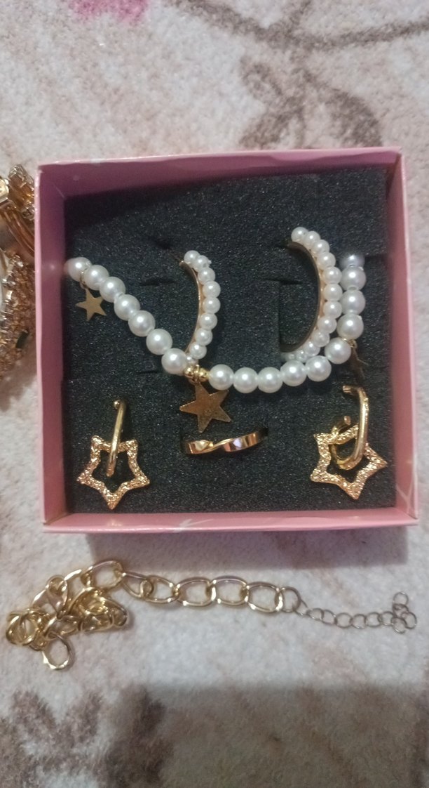 1 yıldızlı ve boncuklu kolye, 2 tane küpe, 1 tane yüzük. Bu kadın takı seti, boncuk detaylı ve yıldız şekilli süslemelerle açık altın tonlarında, Parisli bohem tarzını yansıtıyor. Günlük kullanım için uygundur. ✨