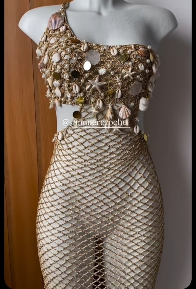Boncuklu ve işlemeli detaylara sahip altın renkli vücut zinciri, deniz kabukları ve ağ desenli. Parti için avangart tarzda.