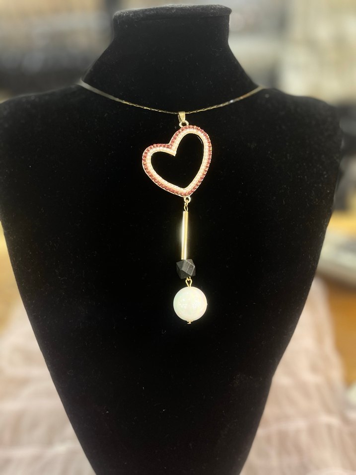 Bu kısa altın renkli kolye, işlemeli detaylı boncuklu kalp ucu ve şık boncuklu sarkıt ile romantik geceler için uygundur.