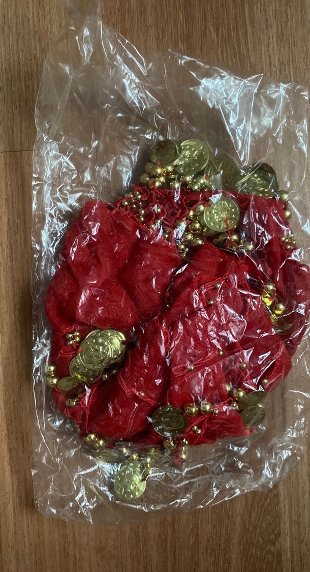 Parlak kırmızı, ipeksi kumaş ve altın boncuklu detaylara sahip bohem tarzda shakira kemeri. Hiç kullanılmadı. Paketli ürün.