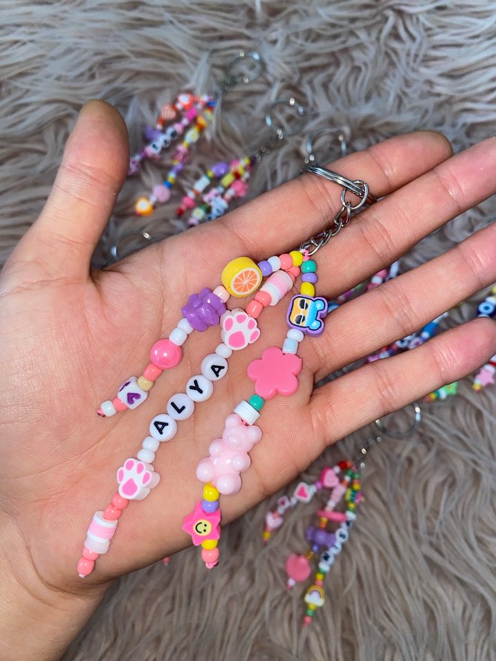 Pastel çok renkli, boncuklu ve kişiselleştirilebilir harf boncuklu kadın anahtarlık. Minimalist bohem tarz için uygun. ️