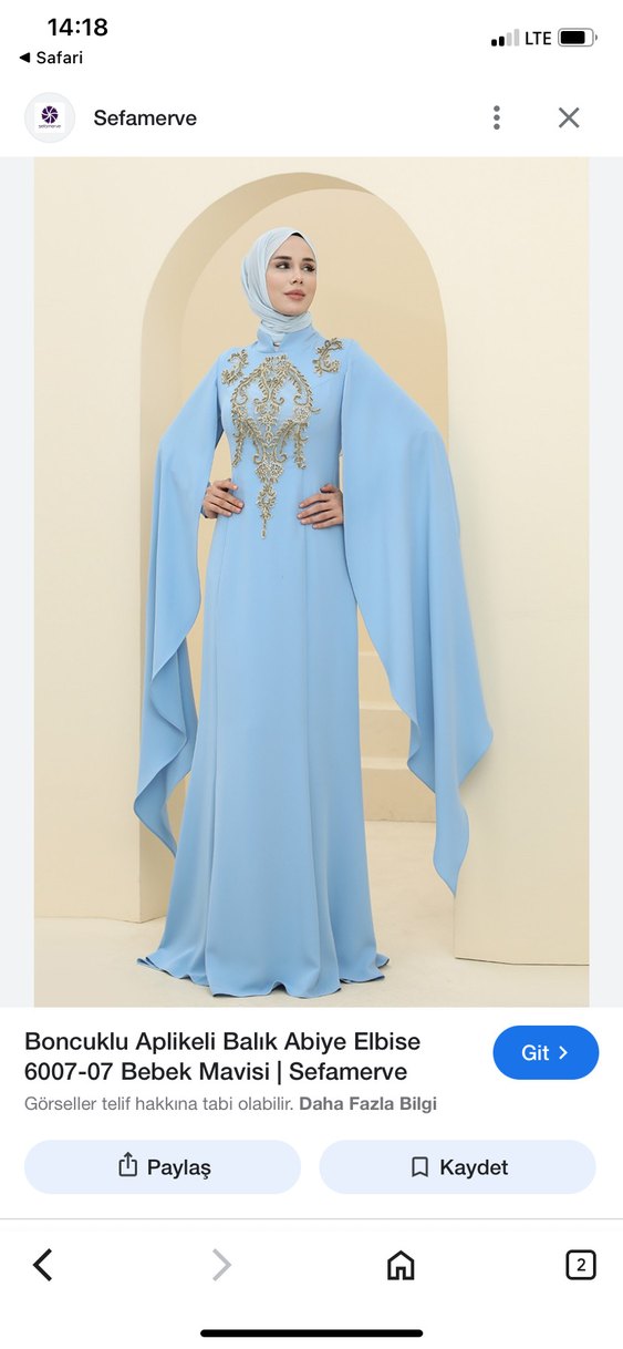 Uzun, bebe mavisi abiye elbise yüksek yakalı ve uzun drapeli kollara sahiptir. Nakışlı boncuk aplikeleri ve bol kesimiyle düğünler için uygundur.