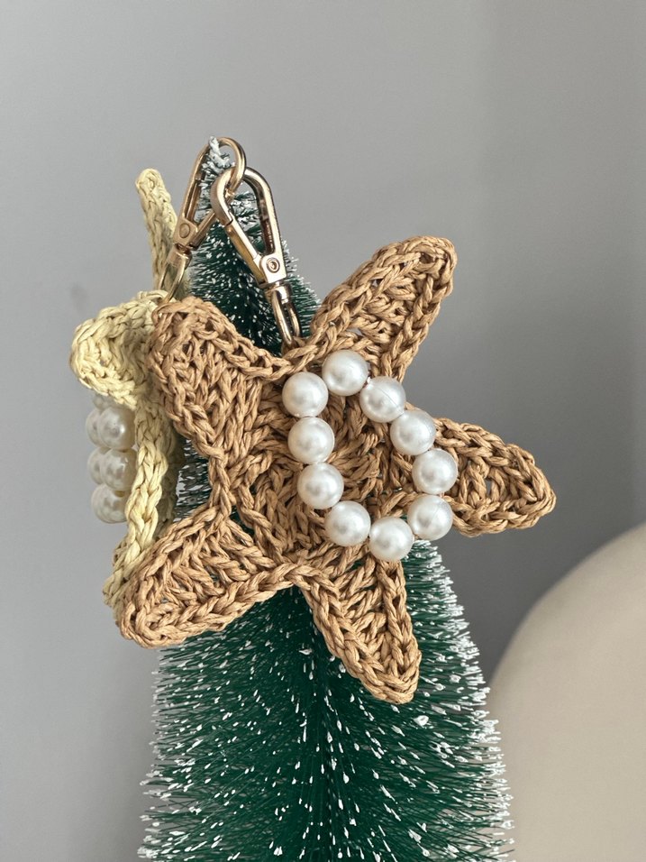 Boncuklarla süslenmiş, bohem tarzda bej renkli yıldız şeklinde anahtarlık, inci görünümlü boncuklarla rahat ve retro bir görünüm sunar.
