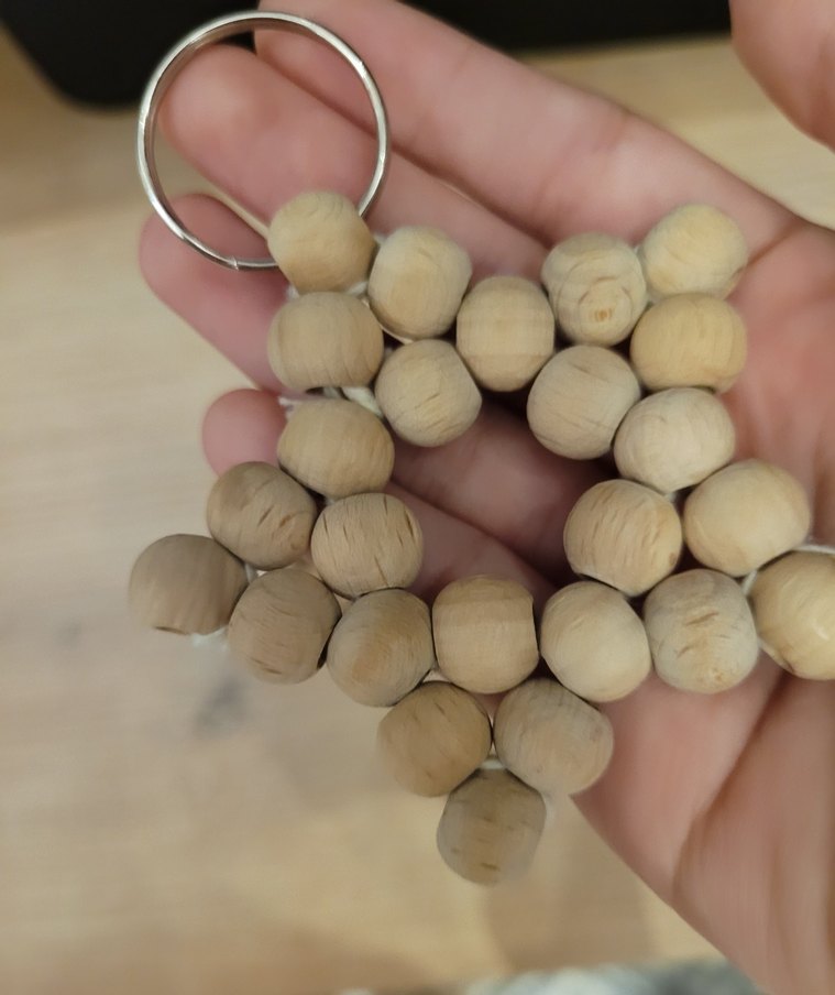 Doğal ahşap boncuklardan oluşan bej renkli bohem tarzda metal halka anahtarlık. Minimalist ve retro bir tasarıma sahiptir.