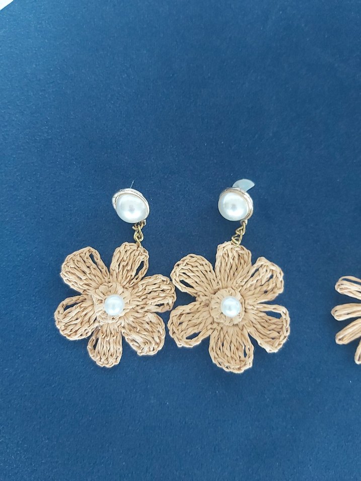 İnci detaylı, boncuklu bej çiçek küpeler, bohem tarzda Kısa uzunlukta ve mini tasarımda, zarif bir görünüm sunar.2 ürün