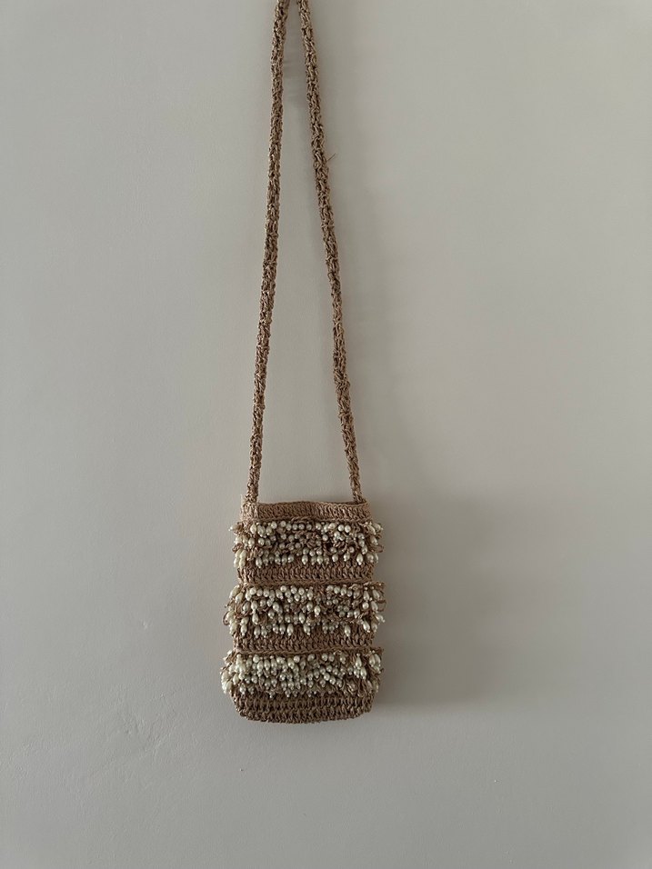 Bej renkli örgü çapraz çanta, işlemeli desenler ve boncuk detaylarıyla bohem tarzını yansıtıyor. Uzun askılı, kullanımı kolaydır.