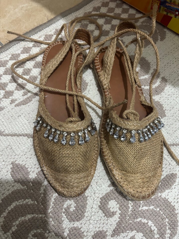 Boncuklu ve nakış detaylı bej renkli örme dolgu topuk sandaletler, bilek bağcıklı, bohem tarzda. Günlük kullanım için uygundur.