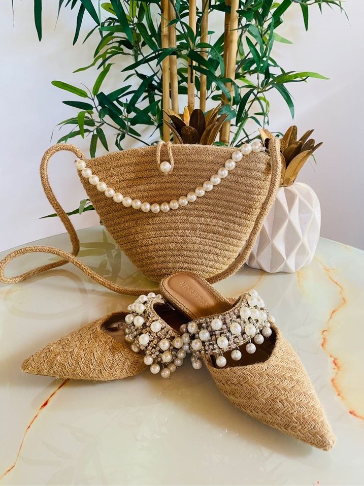 İşlemeli detaylar ve boncuklu inci askısı bulunan bej örgü kadın çanta, günlük kullanıma uygun bohem tarzda.