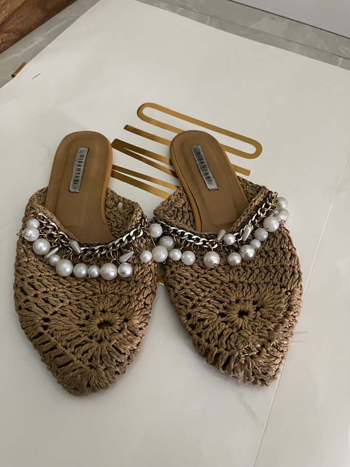 Bej renkli, bohem tarz kadın terlik kullanılmıştır ön kısmı geniştir