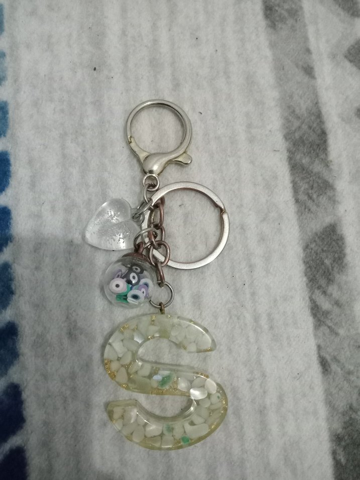 Boncuklu tasarıma sahip beyaz anahtarlık, şeffaf kalp ve dekoratif 'S' figürüyle minimal bohem tarzını yansıtıyor.