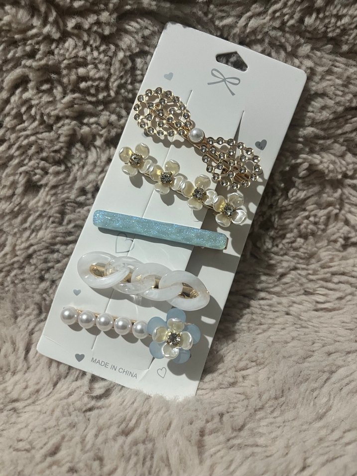 Beaded ve çiçek detaylı, plastikten yapılmış beyaz bohem tarzda 5 adet kadın saç tokası seti. Trendy günlük kullanıma uygun.