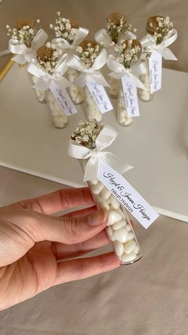 Beyaz boncuklarla dolu cam tüp, beyaz kurdele ve kurutulmuş çiçeklerle süslenmiş minimalist bohem nikah hediyesi.