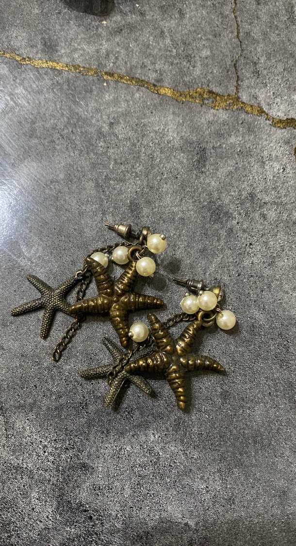 Kısa boylu bohem tarzda, parlak beyaz boncuklu ve vintage deniz yıldızı figürlü küpeler, plaj havası için uygun.