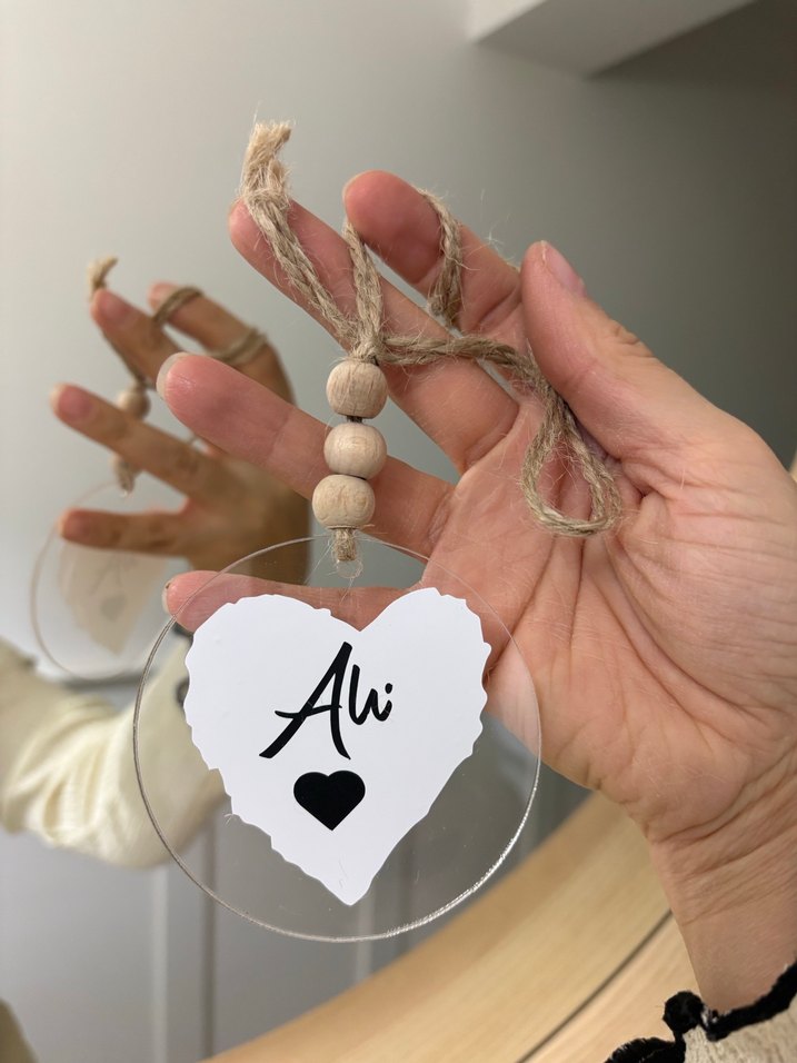 Ali yazılı ve kalp baskılı, boncuklu rustik ipli açık beyaz kalp şeklinde bohem kolye. Düğünler için uygun.