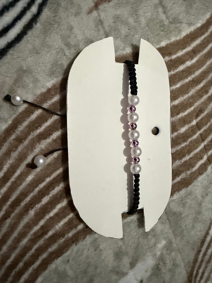 Minimalist bohem tarzda, beyaz ve gri işlemeli boncuklarla süslenmiş siyah örgülü bileklik, günlük kullanım için uygundur. ✨