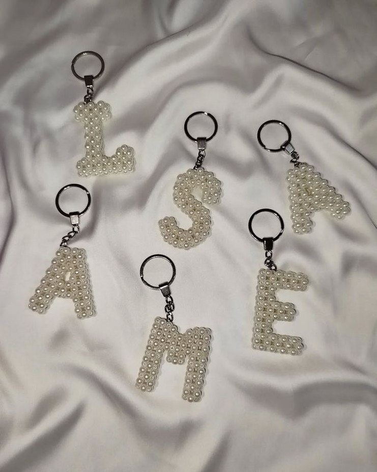 Beyaz boncuklarla yapılmış harf şeklinde anahtarlıklar. Minimalist ve street wear tarzında, açık renk tonuna sahip.